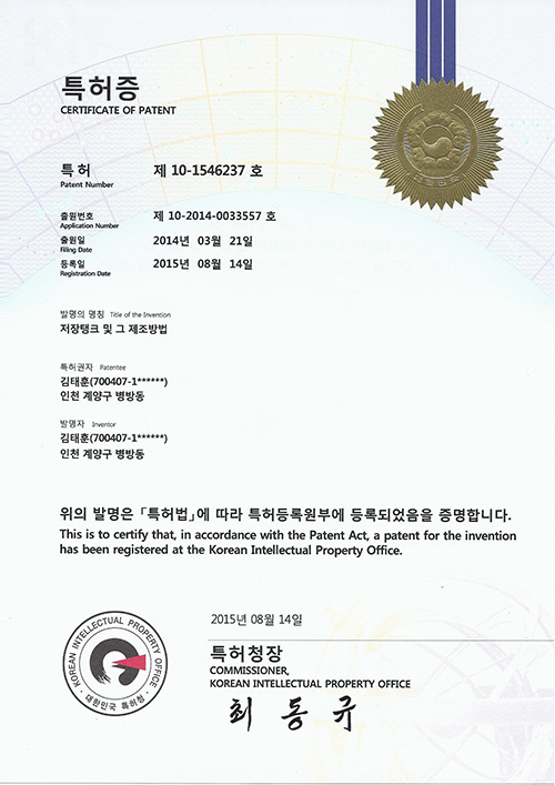 특허증-저장탱크 및 그 제조방법