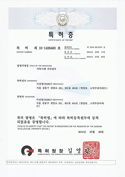 특허증-가축사체처리장치